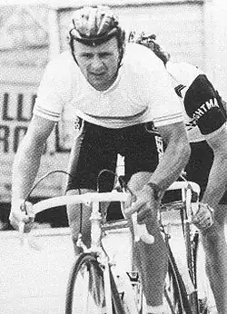 He then joined the French team, Athletic Club Boulogne-Billancourt in Paris, Europe's most successful sports club with fellow British riders Sean Yates and Jeff Williams.[9] Herety won his second race for the ACBB which was a circuit of Toulon finishing in a bunch sprint.[10] Herety spent one season with the ACBB and was offered a professional contract with Mercier riding alongside Joop Zoetemelk.[9] In 1982 he had hoped to get a ride in the Tour de France.[11] However, a poor performance in the Tour de l' Aude resulted in him not being selected by the Coop-Mercier manager Jean–Pierre Danguillame.[11] Herety subsequently returned to England and won the Professional British National Road Race Championships.[7] He also had success in the Grand Prix Pino Cerami finishing second after being outsprinted from a small group of riders by Ronny Van Holen.[11] However, after three seasons with Mercier he had reached a level that he was unable to improve on.[12] Herety explained: “My trouble is that I can’t recover quickly enough after a hard stage race or a race." "When I’ m racing abroad that is no good, with so many races to ride one after the other.”[12] In 1985 he consequently decided to join the British-based professional team Ever Ready allowing him to race on the weekends and if needed have the whole week to recover.[12] In 1986 he then joined Percy Bilton riding alongside Bob Downs and Steve Joughin. The following season he won a stage in the Milk Race and was runner up in the British National Road Race Championships. John owed his successes to his powerful sprint.[6] However, his inability to climb and recover during hard stage races limited his palmares.[12] Herety was not a general classification rider – evidence his 52nd overall in the 1984 Sealink International.[12]