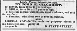 ![]() "Likely Young Negroes for Sale" by J. M. Gilchrist, including 10 boys, 12 girls, three house carpenters, and four families (Charleston Daily Courier, August 17, 1858) |