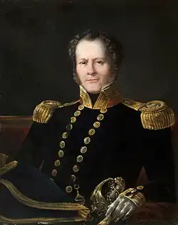Maitland was born in Scotland in 1771, the third son of Colonel the Honourable Richard Maitland, who was himself the fourth son of Charles Maitland, 6th Earl of Lauderdale.[1][2] His mother was Mary Maitland, née McAdam, of New York City. John Maitland was born into a substantial naval dynasty. His uncle was Frederick Lewis Maitland, who was a captain in the navy, and his first cousin was Frederick Lewis Maitland, who reached the rank of rear-admiral.[1] John Maitland also entered the navy, and by 1793 was a midshipman aboard John Jervis's flagship HMS Boyne. Maitland was involved in the attacks on the French colonies of Guadeloupe and Martinique, often serving on shore with landing parties.[1][2] In the assault on Fort Fleur d'Épée he was the first person over the walls, and came to the rescue of Captain Robert Faulknor when Faulknor was attacked by two Frenchmen. Maitland ran one through with a pike and went on to kill another seven or eight of the garrison.[1][2] During the attack on Pointe-à-Pitre, Guadeloupe, Maitland took over command of the landing parties as an acting-lieutenant when all of the more senior officers had been killed or incapacitated by wounds or exhaustion.[1][2]