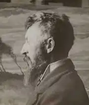 He also had studios at his various residences.[115][116] His last studio at his South Yarra residence was described as a large low room with polished floor contained a grand piano and a few art treasures and beautiful hangings. The artist's own pictures took up most of the wall space, and the dark polished floor was shining perfection. ... Mather’s own little grandson was sometimes an interested spectator when the artist was at work. Once the child asked “Why is that cow white, grandpa?” In reply the artist explained the colour scheme of his picture it some length, concluding with the exact reason why, to complete the colour scheme, that cow in the foreground was white. To all of which the five-year-old child listened patiently, then contradicted him briefly with, “Tis not. It's because it's full of milk "[117]