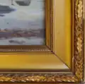 ^Morning San Remo is an oil painting on canvas signed and dated J.Mather.1.1900. in a precise hand. The picture frame with a W & G. Dean label, is most likely the original exhibition frame. Reflecting its age, the frame is in need of restoration with the least damaged area illustrated here.Frame Detail of Morning San Remo 1900 John Mather A small cloth tag attached to the reverse of the frame has San Remo hand written in brown ink. This is not illustrated to prevent modern reproduction. The view is recognisable as looking east from San Remo Beach towards the Strzelecki Ranges. Source: Inspection of the painting 22 Dec 2022.