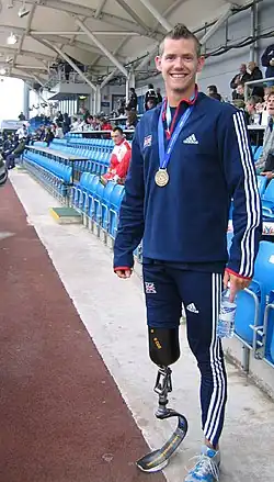 In 2000, when he was 19 years old, his right leg was amputated above the knee following a serious motorcycle accident. He took up running again after being fitted with a prosthesis, and participated in his first race in 2004. The following year, he was selected to represent Great Britain at the International Paralympic Committee (IPC) European Championships, and took the bronze medal in the 200 metres (sport class T42).