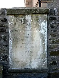 Mylne was well established as a mason by the 1580s. He was made a burgess of Dundee in 1587 for various works in the city, and in particular his renewing of the royal burgh's harbour.[2] He also built the mercat cross which formerly stood in the High Street.[4] In 1584-5 he was engaged on alterations to The Drum, a tower house in Lothian, for the 7th Lord Somerville.[5][6] In 1589 he built or extended Bannatyne House in Newtyle, Angus, for justice Thomas Bannatyne.[7] Mylne was Master of the Mason's Lodge at Scone at a time when the mason's lodges were moving away from being simply craft guilds, and he admitted King James VI to the lodge as a Freeman Mason.[2]
