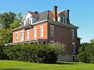 This is the oldest house in The Park Place-Grand Avenue Residential District.[2] It reflects a combination of architectural styles, namely Greek Revival, Italianate, and Neoclassical. It is not known what the house looked like when it was originally built, but it is thought the Greek Revival elements on the lower part of the house may be an indicator of its style.[2][4] The 2½-story structure is composed of brick with a limestone foundation and a hip roof with a bracketed cornice. A large dormer with a Palladian window is located in the center of the main facade. The front porch is not original and is thought to date to the turn of the 20th century. Other changes were made during Irwin's ownership. A ballroom was located at the top of the house, but on warm summer evenings the parties were moved to the backyard, which was all brick at the time. It has subsequently been landscaped. The house is located at the crest of a bluff that overlooks the Mississippi River and Lock and Dam No. 19.