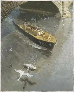 After the war Platt exhibited at the New English Art Club, for the British Council and in 1922 won a gold medal at the International Print Makers' Exhibition organised by the California Society of Printmakers.[9][10][11] As well as designing several posters for London Underground, he continued to teach. Platt taught at the Harrogate School of Art throughout 1919, the Derby School of Art in 1920 and was Head of the Department of Fine Art at Edinburgh College of Art between 1920 and 1923, before becoming Principal of the Leicester School of Art from 1923 until 1929, when he moved to London to become head of Blackheath School of Art.[8][5] Throughout the 1930s, whilst teaching at Blackheath, Platt produced a number of highly regarded woodcuts, prints and seascapes. He published numerous articles and the book Colour Woodcuts: a Book of Reproductions and a Handbook of Method,(1938).[4] From 1938 till 1953, Platt was the President of the Society of Graver Painters in Colour.[1][12]