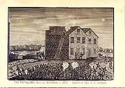 Woodcut showing a large group of armed men attacking the Alton Observer building on November 7, 1837. The riot resulted in the death of Reverend Elijah Parish Lovejoy, abolitionist, newspaper editor, and Presbyterian minister. Photograph and Prints collections, Missouri History Museum