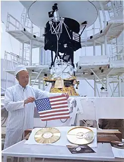 Casani with a small US flag and the Golden Record in front of Voyager 2, 1977