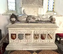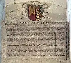 His monument in Great Bedwyn church consists of a chest tomb displaying heraldic escutcheons, surmounted by his recumbent effigy, fully dressed in armour with hands in prayer, his head resting on his helm from which projects the sculpted Seymour crest of a pair of wings. His feet rest on a lion, and a sword lies by his side.[38] On the wall above is a tablet inscribed as follows:[14][39][40]