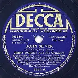 Jimmy Dorsey and His Orchestra recorded "John Silver" on April 29, 1938, and released the song as a Decca 78, 3334A, Matrix # 63689, with Bob Eberly on vocals.[1] The single reached no. 13 on Billboard in 1938, staying on the charts for 2 weeks.[2]
