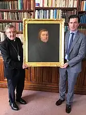 Bishop Crean accepting a portrait of his predecessor Bishop John Sleyne from Tadhg Dorgan, BL, which has been given to the Diocese on permanent loan by the Dorgan family of Mourne Abbey. November 2022. [43]