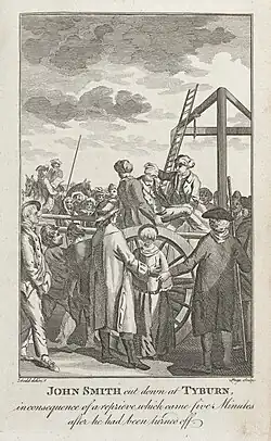 Smith's family and friends were present at his hanging. Some attempted to tug at his legs to shorten his suffering, while others held them up for the mere possibility that Smith would not die. Others fought over the body with anatomists.[4] After hanging for a quarter of an hour, the people cried out 'A reprieve'! The reprieve was granted, and Smith was cut down. He was taken to a house in the neighbourhood, where he recovered.[3]
