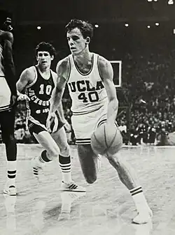 After transferring to UCLA in 1968, he became an integral member of the Bruins' backcourt in 1968. Vallely was quick to make the transition from forward to guard at UCLA. In his first season, he was the Bruins' third leading scorer (12.9 ppg) and adapted smoothly to head coach John Wooden's "attack and gamble offense".[1] He was a member of the UCLA teams that won national titles in the 1969 NCAA tournament and the 1970 NCAA tournament. Vallely majored in economics at UCLA and had a 3.36 grade point average as a junior.[1]