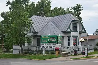 The John and Amelia McClintock House is a historic building located at 321 E. Main Street in Grafton, Illinois. Boat builder John McClintock built the house for his family circa 1910. The rock-faced concrete house, an unusual departure from Grafton's limestone buildings, has a Queen Anne design. The entrance is located at the corner of a wraparound front porch and is topped by a conical roof. The front of the house has a cutaway bay, giving the house an asymmetrical appearance, and the gable roof has multiple components; both features are typical of Queen Anne designs. The building is now used as a commercial property.[2]