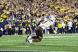 Oladokun with the Bowling Green Falcons in 2023. He is returning his first collegiate interception from Michigan quarterback J. J. McCarthy.