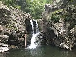 Jordan Run Falls is situated in Jordan Run Gorge, a small canyon opening just northwest of the Smoke Hole Caverns visitors parking lot. Jordan Run enters the main river at this point and the falls is located about 0.8 miles (1.3 km) upstream. It may be accessed by a somewhat arduous hike up the trail-less stream bed.
