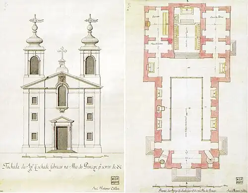 Project on a facade and plan of the Cathedral of São Tomé and Príncipe, made by José António Caldas c. 1757 (AHU)