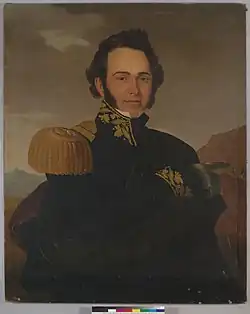 Mexía was originally a supporter of Antonio López de Santa Anna, who was elected President of Mexico on a Federalist platform.[fn 1] During Mexía's 1832 expedition, he traveled to Texas to quell the rebellion started by the Anahuac Disturbances.[7][8] As a senator for the state of México, he participated in an 1834 uprising against President Santa Anna, who had changed his politics to centralism. Two months later, he was captured by centralist forces in Jalisco and sent into exile.[3]