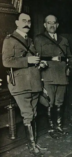 On 10 September 1930, Uriburu was recognized as President of the Nation by means of an infamous and controversial ruling by the Supreme Court, which gave rise to the De facto government doctrine.[13] This doctrine legitimized the new government, "as long as it executes the administrative and political function derived from its possession of the force as guarantee of order and social security."[14] He dissolved the National Congress, declared a state of siege, replaced the governors of the provinces with radical governors through federal intervention, and attempted to establish a neo-corporatist government. In this system of government, similar to fascism, Uriburu saw an example of peace and political order.[15] On 18 September 1930, the ambassadors from the United States and England (a country Uriburu had served as an attaché), recognized his provisional government.