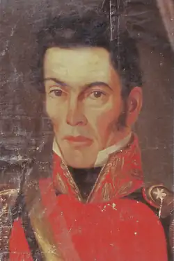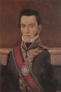 Velasco handed command of the country to Santa Cruz on 24 May and proceeded to be sworn in himself as vice president.[20] For most of his vice presidency, he served simultaneously as minister of war and navy.[21] Two years later on 15 July 1831, the Constituent General Congress convened in La Paz to formally recognize the pair in their positions. At the same time, Velasco was granted the rank of major general while Santa Cruz was elevated to captain general. They took the oath of office the following day.[17][22] His vice-presidential term came to an end on 23 July 1835 when Mariano Enrique Calvo was elected to succeed him.[23] In recognition of his service, the Senate conferred upon him the honorific title of Eminent Republican.[24]