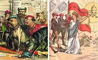 101. ^ the thread was regularly exploited in Liberal propaganda throughout most of the 19th century, with endless articles and cartoons presenting Carlism as a reactionary movement powered by ignorance, fanaticism and backwardness. This opinion enjoyed further popularity in the 20th century, perhaps its most famous manifestation having been the phrase attributed to the socialist leader Indalecio Prieto: “a Carlist is a red-topped animal which lives in the mountains, eats communión, and attacks people”, repeated also in progressive 21st century publications, compare e.g. María Eugenia Salaverri, Lecciones de historia, [in:] El Pais 22.08.2014