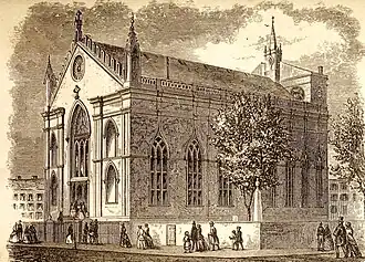 After his return to New York City, Mangin designed the First Presbyterian Church on Wall Street (1810), which was rebuilt twice before being taken apart and moved to Jersey City;[17][18] and the city's original Greek Revival-style St. Patrick's Cathedral (1809-1815) at the corner of Mott and Prince Streets, which was altered after a fire in 1866 into a Gothic parish church, and was elevated to basilica status in 2010.[19]