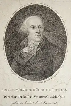 Jacques Joseph Thulis was born into a family of rich merchants; his father Pierre Thulis and his brother Jean-Baptiste were respectively 2nd alderman in 1753[1] and 1st alderman in 1788.[2] After studying at the Jesuit college, Joseph was sent to Cairo to manage a branch of his father's company; he stayed there for a little over six years. He returned to Marseille in 1772 and devoted himself to mathematics, physics and astronomy. In 1786 he went to Hyères where an observatory equipped with good English-made facilities had been installed by the Duke of Saxe-Gotha. In the company of the Duke and Franz Xaver von Zach he undertook a trip to Italy to visit the main observatories of this country.