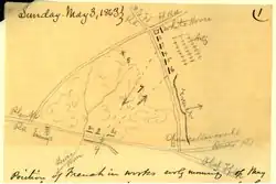 On the morning of May 3, 1863, near Falmouth, Virginia,[43] division commander Maj. Gen. Hiram Berry was mortally wounded after charging the Confederate line. Next in seniority was General Mott, who was severely wounded; therefore, Revere assumed command of the group.[44] As the battle lacked a clear front line, Revere commanded his troops (the Army of the Potomac) to reform at a point set by compass.[40] This three-mile march, described by Revere as a "regrouping effort" and not a retreat, led to his being court-martialed as ordered by General Joseph Hooker.[44]