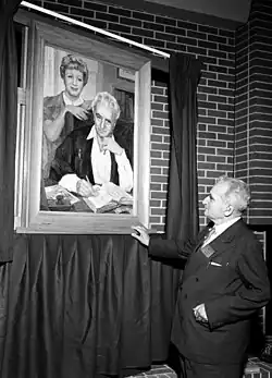Theodore von Kármán looks at a painting of himself and his sister Josephine de Kármán