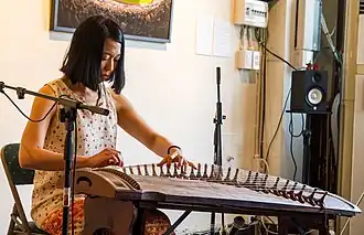 She worked in Hongdae for five years, becoming popular as a fusion indie musician, known as the first with a gayageum to perform there on a regular basis.[6] She uses a 25-string variant of the original 12-string gayageum, to give variations in the range of notes, and incorporates her Western music theory and jazz training in her compositions.[6][7]