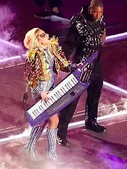 On February 5, 2017, Gaga performed "Just Dance" during the Super Bowl LI halftime show.[87] She was wearing a spicy gold jacket and played on a keytar, while one of her dancers held the microphone for her.[88][89] In the same year, the song was added to the setlist of Gaga's two shows at the Coachella Festival, where she was one of the headliners.[90] On the Joanne World Tour (2017–2018), Gaga wore a pearl-encrusted pale blue bodysuit with dramatic shoulder pads, and knee-high lace up boots while performing the track.[91][92] "Just Dance" served as the opening song of the singer's Las Vegas residency, Enigma (2018–2020). During the performance, Gaga descends from the ceiling in a harness and a sequined jumpsuit while playing on a keytar.[93] In 2022, she performed "Just Dance" at The Chromatica Ball stadium tour.[94]