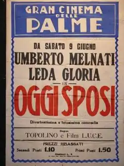 Just Married (Italian: Oggi sposi) is a 1934 Italian comedy film directed by Guido Brignone and starring Umberto Melnati, Leda Gloria and Ugo Ceseri.[1] It was shot at the Cines Studios in Rome.[2] The film's sets were designed by the art director Guido Fiorini.