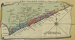 Justly Watson, James Bramham and John Apperly were the first Royal Engineers ever sent into that part of the world. An address to the King had been carried in the House of Commons on the defenceless state of the British possessions on the west coast of Africa, and the three engineers had been directed, by resolution of the House of Commons passed on 22 April 1755, to inspect the fort at Annamaboe and the other British stations on the coast.[9] Watson visited the military stations along the Gold Coast at Whydah, James's Island, Accra, Prampram, Tantumquerry, Winnebah, Annamaboe, Secondee, Dixcove, and Cape Coast Castle.[6] The two senior officers (Watson and Bramham) returned to England in the summer of 1756, but Apperly stayed on the Coast for some years superintending the construction of new works at Annamaboe.[9] Watson's reports and plans were approved and the House of Commons voted money to carry out his proposals.[6]