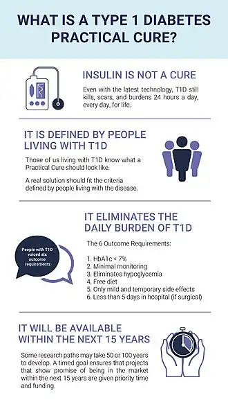 The organization defines a Practical Cure as any solution that gives people living with the disease the chance to live a normal, unrestricted life. The clinical requirements of a Practical Cure are defined by those living with T1D who understand the daily burden. Practical Cure requirements include testing blood sugars once a week or less, eating an unrestricted diet, a greatly reduced and simple regimen of medication, sleeping worry-free, experiencing minimal to no diabetes side effects, and experiencing fast recovery from surgeries.[2]