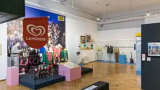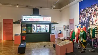 Other objects include Cologne's historical Ratssilber, textiles, and since 1985 also increasingly current and contemporary art, such as a painting of Cologne Cathedral by Andy Warhol. In addition, gaps were filled in the area of everyday history and everyday life, the subject of guest workers was approached[22] and thus increasingly the present, from whose everyday culture objects are regularly taken into the collection. Examples of this are a printed kippa from the visit of Pope Benedict XVI to the Synagogen-Gemeinde Köln in 2005, a German flag from the 2006 FIFA World Cup or costumes from the Cologne studios of the TV Series Lindenstraße. Equally, however, there is also evidence of more serious events from Cologne's recent past: a flag from the election campaign stand where the assassination attempt on Henriette Reker was carried out, the notebook of a refugee from Syria with plans for the reconstruction of his house, and finally a surgical mask worn in the Cologne city council during the COVID-19 pandemic.[47]