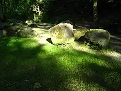 The main attraction in the up to 70-metre-deep (230 ft) incised gorge is the wild, primeval landscape. Sometimes rock slides occur there, the last on 24 April 2013 when a 250-tonne (551,156 lb) boulder crashed on the pathway.[1] Nevertheless, the pathway is very popular for hiking, usually starting in Forch and ending at the landing gate of the Zürichsee lake transportation company Zürichsee-Schifffahrtsgesellschaft (ZSG) in Küsnacht. Points of interest include the so-called Drachenhöhle towards the Wulp Castle (built by the House of Regensberg) besides the gorge: The literally Dragon's Den is a small cave that was washed out of the glacial Nagelfluh conglomerate.[2]