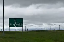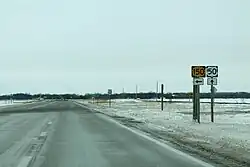 The route has changed little, but in August 2001, work began on a $17.5 million (equivalent to $28.8 million in 2023[13]) project to reconstruct the entire length of K-150. New bridges were built, asphalt shoulders were added and the sight distances were improved. Work was completed by August 2003.[14] In 2012, KDOT decided that the western terminus was to be rebuilt as an enhanced roundabout.[15] Construction on the $5.416 million (equivalent to $6.81 million in 2023[13]) enhanced roundabout at the western terminus began in June 2015. The roundabout was enhanced by leaving in place the shooflies that were installed to take traffic around the site during construction. This allows oversized trucks that wouldn't fit on the roundabout to pass.[16][17] K-150 was closed from early September 2015, to late December 2015, and traffic was detoured south along US-77 to make room for construction on that section of the roundabout. The roundabout was completed and open to traffic in December 2015.[18]