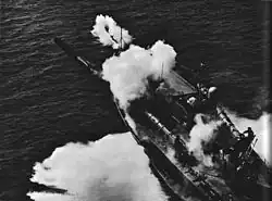 Moment of torpedo launch from the deck of the Polish P 6-class torpedo boat