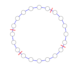 and is taken modulo N. In analogy to molecular motion, the system is time-reversible. Indeed, if balls would move clockwise (instead of counterclockwise) and marked points changed color upon entering them (instead of leaving), the motion would be equivalent, except going backward in time. Moreover, the evolution of is periodic, where the period is at most . (After N steps, each ball visits all M marked points and changes color by a factor .) Periodicity of the Kac ring is a manifestation of more general Poincaré recurrence.[6]