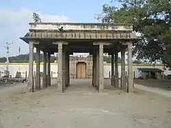 The temple has a flat gateway tower and all the shrines of the temple are enclosed in concentric rectangular granite walls. There is a sixteen pillar hall in front the gateway that has sculpted pillars dating back to the 16th century. The temple occupies an area of around 2 acres (0.81 ha). The temple tank is located adjacent to the sixteen pillared hall. The central shrine houses the image of Kachabeswarar in the form of Lingam. The shrine of Irulneeki Thayar (also called Anthaga Nivarini, facing West is located in the Mahamandapam leading to the sanctum. The central shrine is approached through the shrine of Thyagaraja located adjacent to the sanctum. As in other Shiva temples in Tamil Nadu, the shrines of Vinayaka, Murugan, Navagraha, Chandikesa and Durga are located around the precinct of the main shrine. There is a shrine depicting Shiva offering food to Sundarar on the Western side.[3] The sanctum is approached through a side entrance. The sanctum is in the form of a moat. The first precinct around the sanctum has the images of Vinayaka, Surya, various images of Nagalinga, Valli Deivanai, Subramanya, Nataraja, images of Nalvar. The shrine of Amman is a West facing shrine where the deity Anjanatchiamman is sported in standing posture.[1] The original complex is believed to have been built by Cholas, while the present masonry structure was built during the Nayak during the 16th century. In modern times, the temple is maintained and administered by the Hindu Religious and Charitable Endowments Department of the Government of Tamil Nadu.[4]
