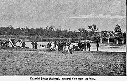 The original rail bridge was built in 1877.[10] Three spans of the bridge were washed away in June 1882.[21] The 1882 temporary bridge included 30 tons of cylinders[22] and wooden piles.[23] It was back in use in August 1882.[24] A permanent replacement was being built in October 1882[25] and completed in June 1883.[26] The railway bridge was swept away again in 1897.[27] It was converted to a road rail bridge[28] from 5 March 1900.[29] A loose beam on the bridge hit a train in 1933.[30]