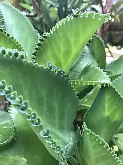 It is often misidentified as one of its putative parents, K. daigremontiana, which has bands or spots on the back of leaves, while the leaves of K. laetivirens are completely green, as indicated by its epithet laetivirens which means "lushly green".[3]