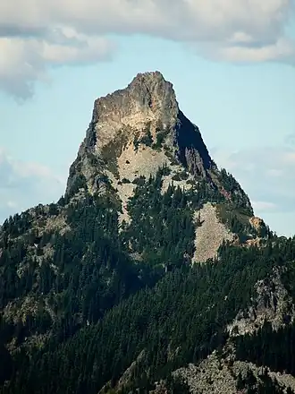 Kaleetan Peak is a prominent 6,259-foot (1,908-metre) mountain summit located in King County of Washington state. It's part of the Cascade Range and is situated four miles northwest of Snoqualmie Pass. Kaleetan Peak is set within the Alpine Lakes Wilderness on land managed by Mount Baker-Snoqualmie National Forest.[1] It's immediately west of Melakwa Pass and Chair Peak, and north of Melakwa Lake. Precipitation runoff from the mountain drains into tributaries of the Snoqualmie River. Topographic relief is significant as the summit rises approximately 2,400 feet (730 m) above Kaleetan Lake in 0.6 mi (0.97 km). The nearest higher peak is Snoqualmie Mountain, 2.89 miles (4.65 km) to the east.[1] The mountain's name "Kaleetan" derives from Chinook Jargon which means "arrow".[4] The peak was named by members of The Mountaineers and the toponym was officially adopted in 1916 by the U.S. Board on Geographic Names.[5]