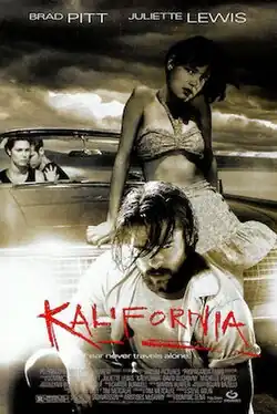 Kalifornia is a 1993 American road thriller film directed by Dominic Sena, in his feature film directorial debut. It stars Brad Pitt, Juliette Lewis, David Duchovny, and Michelle Forbes. The film tells the story of a journalist (Duchovny) and his photographer girlfriend (Forbes) traveling cross-country to research serial killings, who unwittingly carpool with a psychopath (Pitt) and his childlike girlfriend (Lewis).