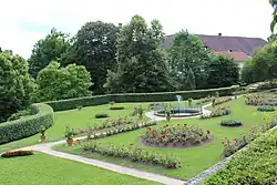 The Kamenice nad Lipou Castle was built in the middle of the 16th century and in 1580–1583, when the original castle from 1248 was converted into a Renaissance mansion graced by a courtyard with arcades and a garden. The entrance tower was built in 1744. In the early 19th century, F. Rilke (grandfather of Rainer Maria Rilke) had the castle modified. In 1839–1842, the Geymüller family had rebuilt the castle into its present Neoclassical appearance. The castle is surrounded by an English park featuring a linden tree estimated to be 700–800 years old, after which the town was named (nad Lipou = 'at linden tree').[1][2][3]