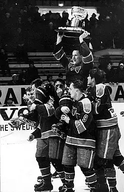 Porin Karhut player holding the Kanada-malja after winning the Finnish Championship of ice hockey in 1965