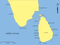 After the death of King Vimaladharmasuriya I in 1604, the kingdom of Kandy became politically unstable due to a succession struggle which ultimately resulted in Senarat's ascension to throne.[2] Senarat who used to be a monk, left priesthood on the request of his cousin, King Vimaladharmasuriya I,[3] to be the regent of young Prince Mahastana.[4] However, after the death of Vimaladharmasuriya, Senarat married Dona Catarina, the widow of deceased king and crowned himself as King Senarat of Kandy.[2][3] As an ex-priest he lacked King Vimaladharmasuriya's military sense and dynamic leadership leaving the kingdom both politically and militarily vulnerable.[2]