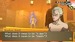 Yu Namba, the Persona 4 Project Lead for Atlus USA, commented that while Kanji's Shadow might offend some players due to it being a gay stereotype, Kanji was nothing like a stereotype. Kanji's sexual orientation was left ambiguous to all players.[8] Namba added "We would like everyone to play through the game and come up with their own answers to that question; there is no official answer ... What matters is that Kanji's other self cries out, 'Accept me for who I am!' I think it's a powerful message which many, if not all of us can relate to."[9] Nich Maragos, Persona 4 Editor for Atlus USA, agreed with Namba, but personally held the opinion that Kanji was homosexual.[9] The localization team of Persona 4 made a point of keeping as true to the original translation as possible.[9] He cited Shadow Kanji's flamboyant personality and stated, "That flamboyance was also what the viewers of the Midnight Channel wanted to see: a typical gay person on TV that people would laugh at. The TV station broadcasts what the audience prefers to watch -- it's a stark portrayal of modern society."[9] Namba also made some scenes which involved Kanji's sexual orientation more subtle without removing the scenes' value.[9]