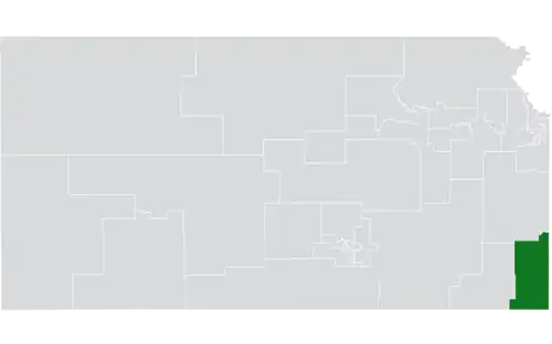 The district is located entirely within Kansas's 2nd congressional district, and overlaps with the 1st, 2nd, 3rd, 4th, and 7th districts of the Kansas House of Representatives.[4] It borders the states of Missouri and Oklahoma.[1]