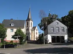Right near the staggered intersection of Kastellauner Straße and Kirchberger Straße – a spot known as the Dreispitz (“three-point” or “tricorne”) – lies the village centre with the old Evangelical church from 1747 (as it says on the iron brackets on the tower) with mediaeval wall components, the bakehouse (called the Backes, a variant of the usual German word Backhaus) with its upper floor that housed the Catholic school's school room and teacher's dwelling until 1849, and two of the village's biggest homesteads with a guest parlour and guestrooms to let.