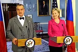 From July 1990 to July 1992 Schwarzenberg served as the chancellor (director of the presidential office) to Václav Havel, while he was president. He went on to be elected as Senator for the municipal district Prague 6 from 2004 to 2010 and to serve as Minister of Foreign Affairs of the Czech Republic from 2007 to 2009 and again from 2010 to 2013, originally as a non-partisan minister nominated by the Green Party. In May 2010, he was elected as a Member of Parliament for the newly founded pro-European centre-right party TOP 09, gaining the largest number of preference votes. He was candidate for President of the Czech Republic in the 2013 presidential election, and qualified for the second round, finishing as runner-up, with 45.19% of the votes.[3][4] Schwarzenberg was noted for his pro-European views.[5]